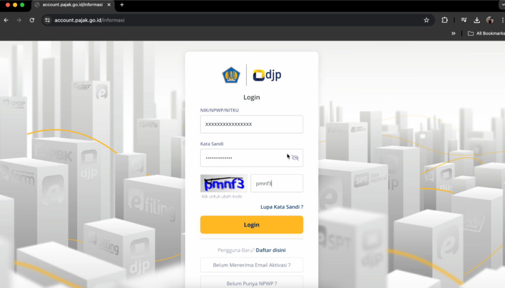 Pertama, buka situs resmi DJP Online di pajak.go.id. Setelah itu, lakukan login menggunakan NIK (Nomor Induk Kependudukan) dan NPWP (Nomor Pokok Wajib Pajak).