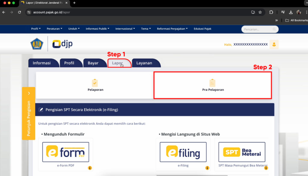 Setelah masuk, kamu akan berada di beranda DJP Online. Cari menu “Lapor” dan klik di situ. Setelah berada di menu laporan, pilih bagian “Pra Pelaporan”.