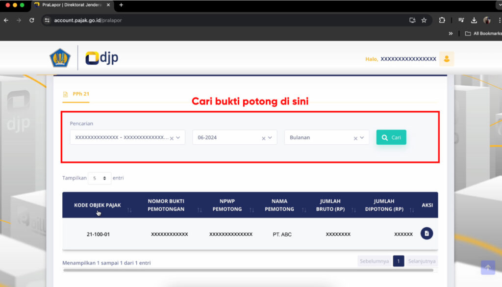 Setelah mengisi detail yang diperlukan, kamu akan melihat informasi seperti kode objek pajak, nomor bukti pemotongan, NPWP pemotong, nama pemotong, jumlah bruto, dan jumlah yang dipotong. Untuk mengakses rincian bukti potong, klik ikon file di kolom aksi. Ini akan memberikan kamu spesifikasi mengenai bukti potong tersebut.